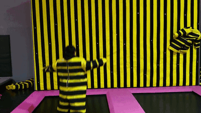 小伙伴穿上粘粘服在蹦床上一跳一跳蹦到粘粘墙边